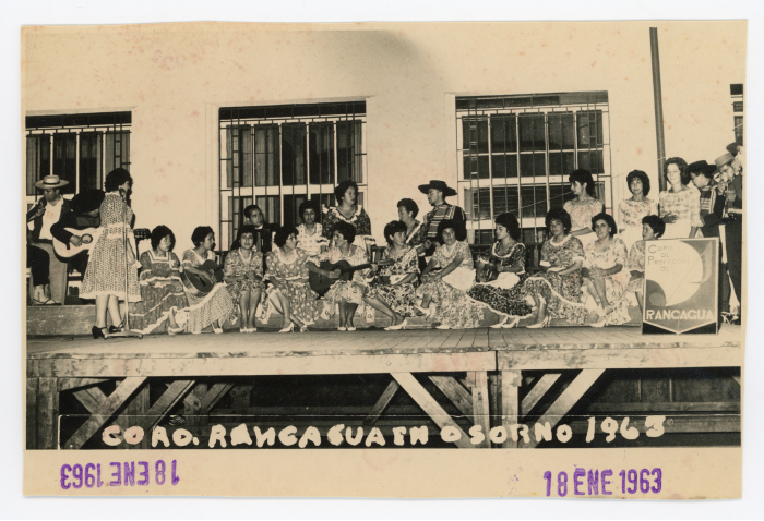 Esta foto corresponde a una presentación del Coro de Rancagua, que viajó a competir a Osorno en 1963. Tanto mi mamá como mi papá eran integrantes del coro y también bailaban folklore. Mi mamá me cuenta que era muy entretenido, ya que cantaban y, luego, rápidamente tenían que prepararse para la presentación de baile. A la derecha, en el borde de la foto, está mi papá, Héctor Zapata Díaz, y, de derecha a izquierda, la tercera mujer de pie es mi mamá, Marta Vitar Astorga.